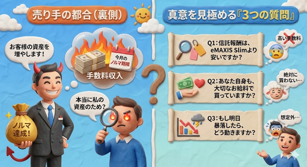 金融商品の裏側には、必ずと言っていいほど「売り手の都合」が隠されています。窓口で熱心に商品を勧められたら、まず目を凝らして、心の中でこう呟いてください。「この人は、本当に私の資産を増やしたいのか? それとも、自分の今月のノルマを達成したいだけなのか?」