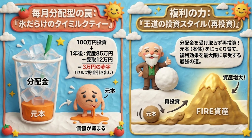 特にこれから資産を築いていく段階にある初心者が、目先のキャッシュフロー(分配金)を得たいがために、将来の大きな利益を生み出す源泉である「元本」を自ら取り崩してしまうのは、資産拡大の観点から見て極めて非効率な行為です。